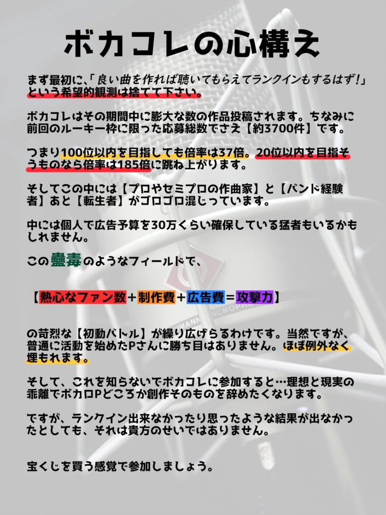 ボカコレというイベントは想像の100倍は作品が埋もれます。そこで曲が悪いんだと自分を責めることだけはしないで下さい。これはもうボカコレという一極集中型の構成をしたイベントが悪いんです。